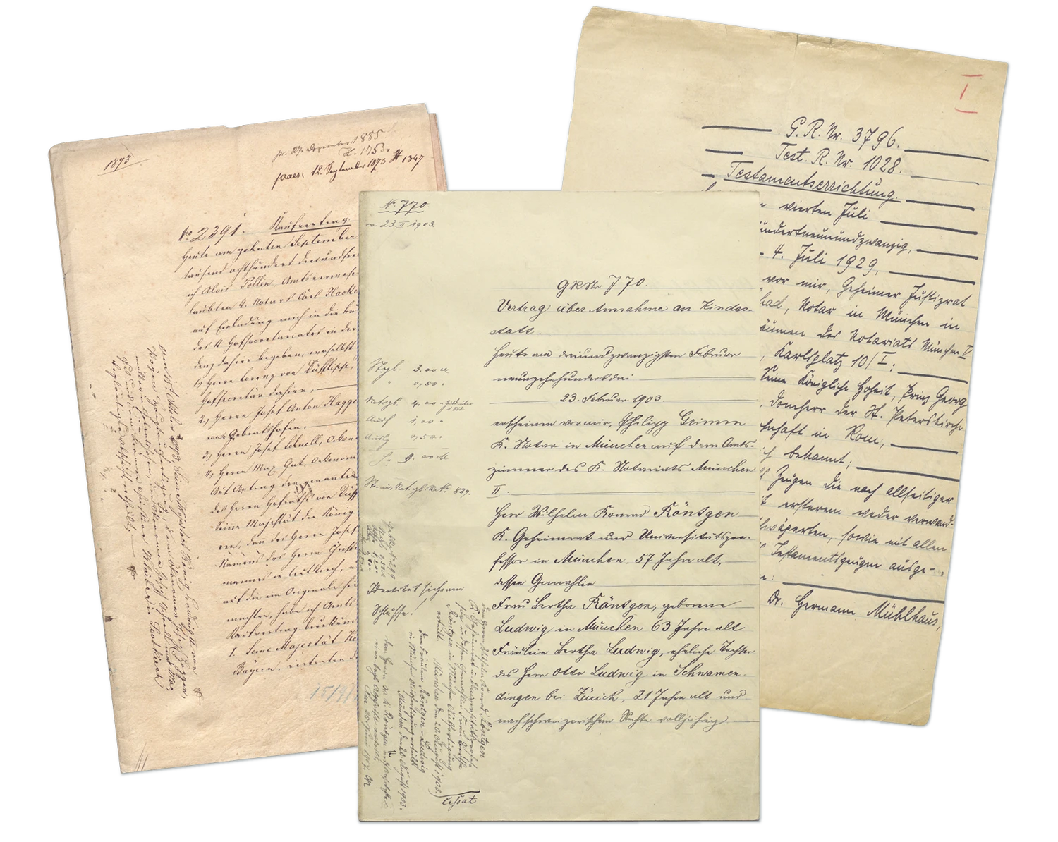 Munich, 23 February 1903 (adoption act)In January 1872, Röntgen married Anna Bertha Ludwig, daughter of an innkeeper from Zurich. The marriage remained childless, but on 23 February 1903, the couple decided to adopt Josephina Bertha Ludwig, Anna Bertha’s niece, who had lived in the house of the Röntgen family since 1887 and, since then, had been raised by the couple. Josephina Ludwig was adopted at the age of 21. It was decided that her new name “Röntgen” was to be added to her former family name “Ludwig” and that she was excluded from legal succession. Nevertheless, Röntgen and his wife named their adopted daughter in their will as heir, alongside friends, household servants, charitable institutions and the city of Lennep.