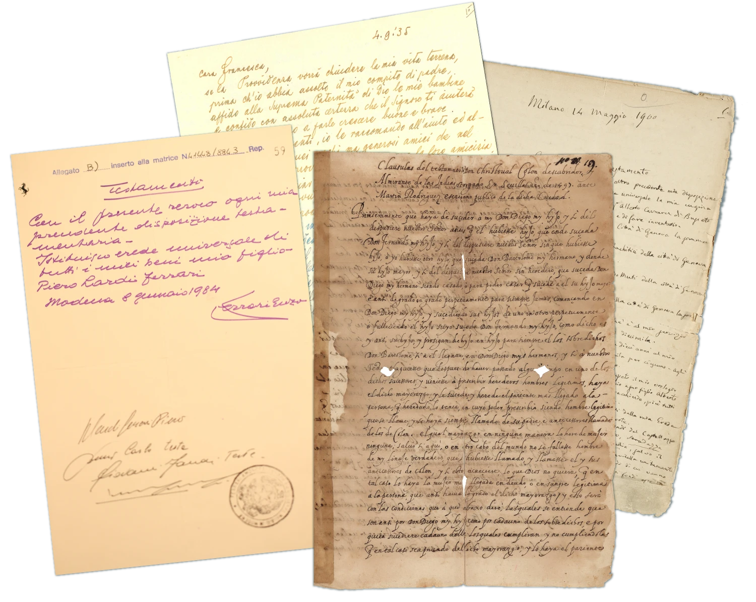 Dans son testament, rédigé le 22 février 1498 dans ce qui est aujourd’hui le Panama, il écrit : « Siendo yo nacido in Genova », c’est-à-dire « étant né à Gênes », déclarant explicitement être « génois ». Par ces mots, il leva un ancien doute, revendiquant ses origines ligures et les liant à jamais à l’une des aventures les plus extraordinaires de l’histoire universelle.